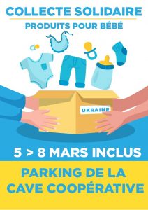 Organisation par la Municipalité d’une collecte uniquement de produits pour bébé (couches, produits d’hygiène, vêtements, etc…) à partir de ce samedi jusqu’à mardi inclus (l’acheminement au plus près des réfugiés se fera par transport organisé par l’IFSi mercredi). Point de collecte: parking de la cave coopérative, le week-end compris.